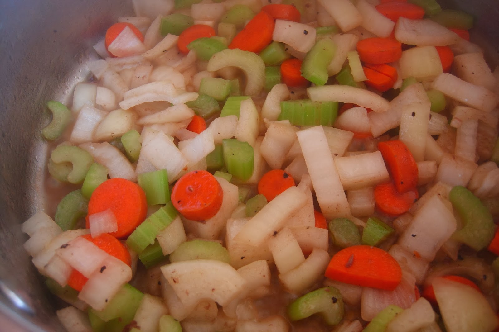 3. Lower the heat on the soup pot to medium, then add mirepoix (mix of onion, carrot, celery), and a little salt. Add more olive oil if needed. Cover the pot and let veggies sweat until tender and the onions are transparent about 10 mins. If they start to brown or stick to the bottom, lower the heat and add a little water.
